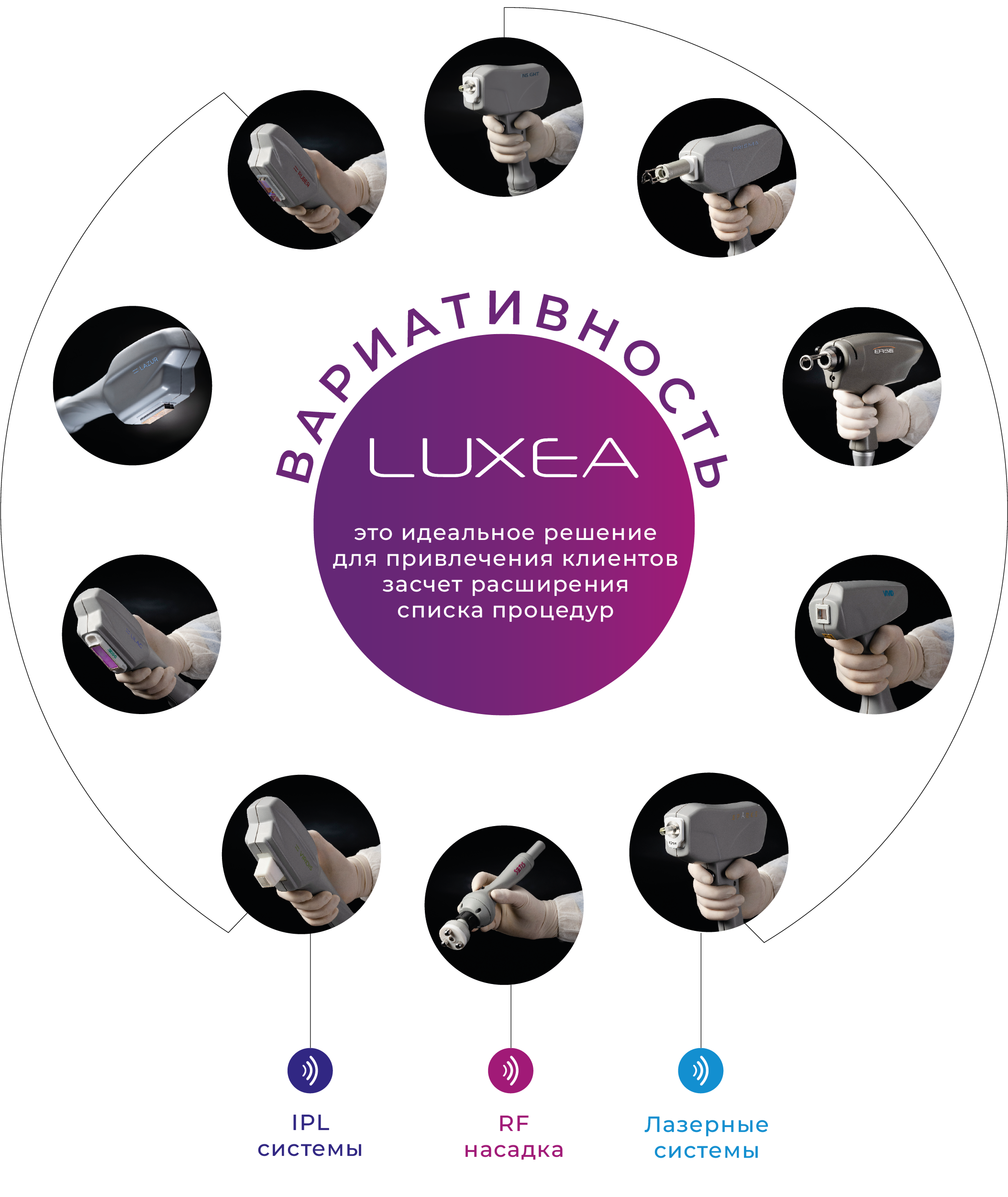 Компания DEKA создала модульную систему Luxea на основе многолетнего опыта и инновационных разработок. Эта система представляет собой универсальный аппарат нового поколения, который объединяет в себе технологии IPL, RF и лазеров. Она отличается высокой многофункциональностью, возможностью индивидуальной комплектации и совмещения различных типов воздействия в одну процедуру. Благодаря этому, достигается максимальный результат при минимальных затратах ресурсов.