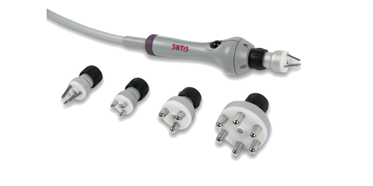 Setis радиочастотный наконечник предназначен для устранения целлюлита, дряблости кожи, и стимуляции выработки собственного коллагена. Пять различных насадок со встроенными датчиками температуры, для работы по лицу и телу.