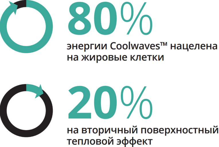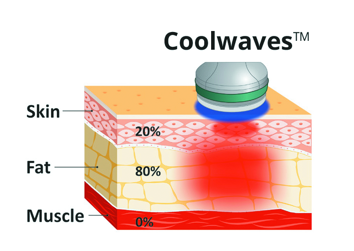 Микроволны Coolwaves™ генерируются на частоте 2,45 ГГц, а такая частота предпочтительно поглощается молекулами жира, а не молекулами воды. Проводимость эпидермиса и дермы намного превышает проводимость подкожно-жировой клетчатки (ПЖК), поскольку в них содержится большое количество воды, а не жира. Поэтому, когда Coolwaves™ проникаютв кожу, они свободно проходят через верхние слои, не поглощаясь и не перегревая их, при этом все эффективное действие таких микроволн концентрируется на ПЖК, которая в основном поглощает их (около 80 % энергии микроволн).